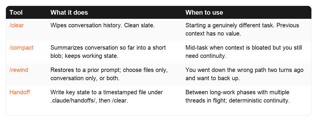 Tool What it does When to use /clear Wipes conversation history. Clean slate. Starting a genuinely different task. Previous context has no value to the next step. /compact Summarizes conversation so far into a short blob; keeps working state. Mid-task when context is bloated but you still need continuity. /rewind (Esc-Esc) Restores to a prior prompt; you choose files only, conversation only, or both. You went down the wrong path two turns ago and want to back up without losing earlier work. Handoff (lifecycle) Write key state to a timestamped file under ./.claude/handoffs/, then /clear. Between phases of long work, especially with multiple threads in flight, where you want deterministic continuity instead of a model-generated summary.