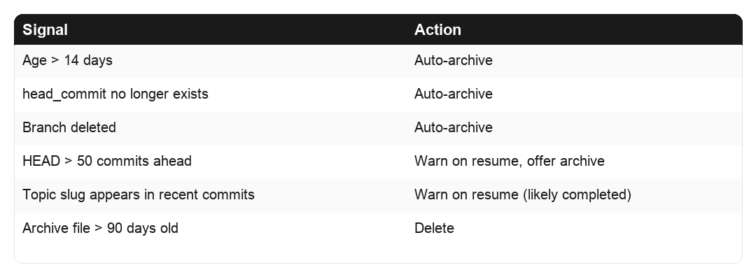Signal Action Age >14 days Auto-archive head_commit no longer exists Auto-archive Branch deleted Auto-archive HEAD >50 commits ahead Warn on pickup, offer archive Topic slug appears in recent commits Warn on pickup (likely completed) Archive file >90 days old Delete